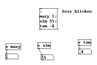 Statt automatisch ablaufender Prozesse können wir aber auch regelrechte „Partituren“ für einen Pd-Patch schreiben. Ein einfaches Beispiel ist die Zusammenfassung mehrerer „send“-Befehle, wie unter 2.2.4.1.3 beschrieben: