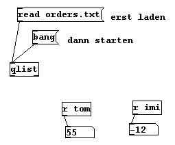 Eine praktische Erweiterung von „textfile“ ist „qlist“. Hiermit können wir zeitlich organisierte Nachrichten mit einer Textdatei an „receive“-Objekte senden. Wir haben die Datei „orders.txt“ mit dem Inhalt: