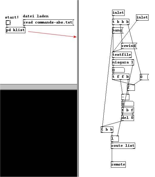 Die Zeiten für qlist sind Delta-Werte, das heißt, wir geben immer den Abstand von einem Ereignis zum nächsten an. Manches Mal wäre es aber auch praktisch eine Textdatei mit absoluten Zeitangaben zu verwenden. Mit Hilfe von „remote“ können wir diese in der gleichen Weise gebrauchen. Das Objekt „remote“ (das nicht in der ursprünglichen Pd-Version enthalten ist, sondern Teil der Maxlib-Library in Pd-extended ist) erhält als Liste den Namen eines receive-Objekts und dahinter den dorthin zu schickenden Wert. Damit erspart man sich mehrere „sends“: