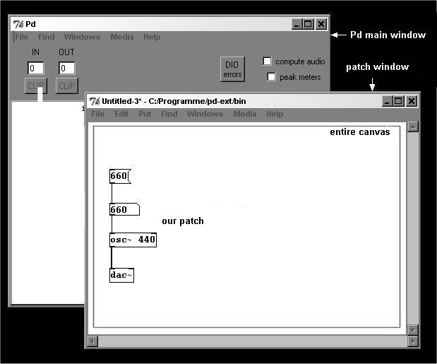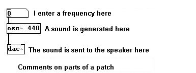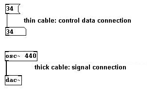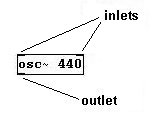The first object you created was "osc~ 440", which is an "oscillator", and you heard a sine tone at 440 Hertz (the meaning of "Hertz" will be explained later). Then you made a number box and entered new values there, which caused the frequency of the tone you heard to change. That is the basic structure in Pd: an object has a name (if it produces signals, a tilde follows the name), then there is a space, and then one or several arguments follow (in this case, the initial 'argument' was "440"). With most objects, the arguments can be replaced with new values that are connected to the inputs (unlike with the "osc~" object here, the changed value usually goes into the far right inlet).