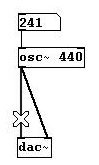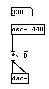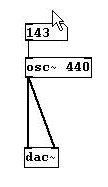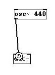 We hear a tone. To be specific, it is A4 (a' in the German system), also called the A440, the standard concert tuning pitch that has a frequency of 440 Hertz (the meanings of "Frequency" and "Hertz" will be explained later). Now connect the outlet from "osc~ 440" with the right inlet of "dac~" as well.