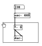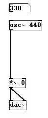 Then go to Edit Cut or simply press BACKSPACE. This terminates the connection. Cut the other connection to "dac~" as well. Now create a new object where the cables used to be: "*~ 0" and connect it to the other objects as shown: