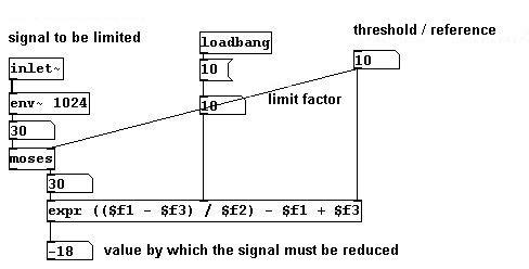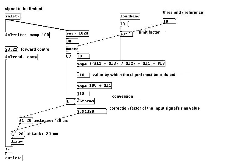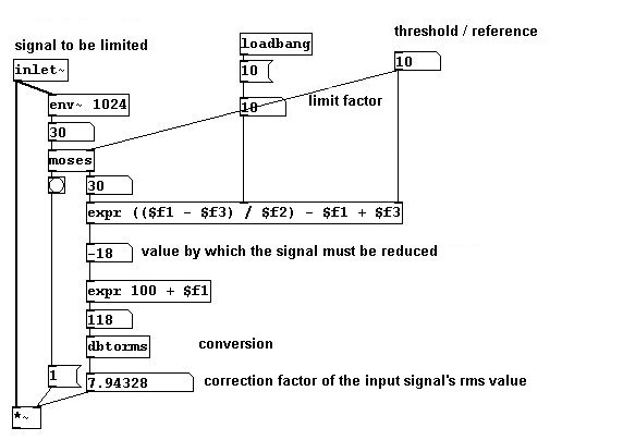 If you connect a microphone input to a speaker - e.g., the "adc~" object directly to the "dac~" - and hold the microphone to the speaker, you'll soon hear a tone (and you'd best point the microphone away fast!). This is because air always contains some noise; the microphone picks it up and sends it to the speaker; the speaker plays it and the microphone picks up this amplified signal; etc. Depending on the distance between the microphone and the speaker, the signal is amplified each time. Depending on the room, cable length, and latency in the computer, this results in different high periodic tones, also called "Larsen Tones". At the same time, volume increases dramatically, as the signal is constantly being amplified. This is the classic case of feedback - a circuit, a recursive system. Wherever microphones and speakers are used, there is a danger of feedback. A limiter used between the microphone and the speaker could help allay this danger.