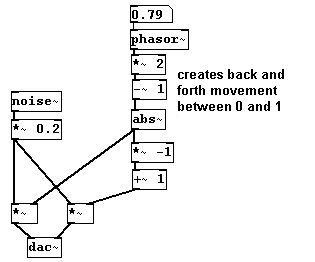 Volume can be used to simulate movement in space. Normally we have a pair of stereo speakers and therefore two inputs for "dac~". If you change the relative volumes of the speakers gradually - provided you are directly between the two speakers - you can experience how sound 'travels' back and forth between the two speakers. This is called a 'phantom sound source'.