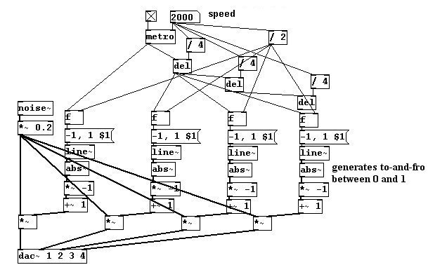 If you have, say, four speakers set up in a square, you can create circular movement through space (naturally, this requires a sound card with four separate outputs; as arguments, you can give the inputs to the "dac~"):