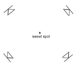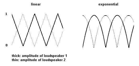 In this case as well, the effect only works correctly if you are precisely in the middle (in the "sweet spot"). In the above example, you can also clearly hear a 'hole' in the volume between the two highest volume levels for each speaker. You should experiment to see whether the overlapping of the volume should be linear or exponential (cf. the window types in 3.9.4). The composer has to use her ear and decide for herself.
