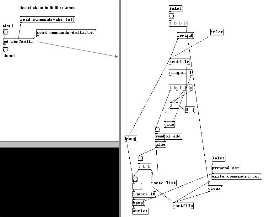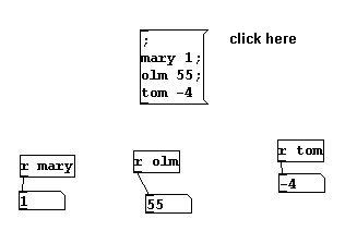 The time for qlist are delta values, that is, they always describe the time interval from one event to the next. Sometimes it might be more practical to write text file with absolute time intervals instead. The "remote" object can be used to accomplish this. "remote" (not available in the original version of Pd; it's part of Pd-extended) receives the name of a receive object as a list followed by the value that you want to send there. This saves you from having to use several "sends":