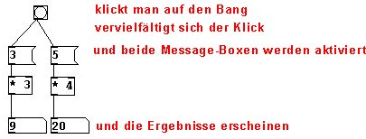 Möchte man nun mit dem selben Wert mehrere Rechnungen gleichzeitig durchführen, z.B. 3*3 und 3*4, dann kann man die Number-Box oder Message-Box einfach an mehrere Inlets anschließen (hier verwenden wir der Einfachheit halber als Multiplikator keinen Input, sondern ein Argument („*3“ und „*4“); in den vorherigen Beispielen haben wir hingegen gar keine Argumente vorgegeben, sondern nur Inputs. Wenn wir ein Objekt ohne Argument schreiben, geht Pd erst einmal von einem Wert „0“ als Argument aus.):
