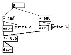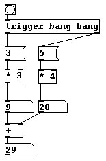 An den Rechen-Objekten wird eine grundsätzliche Regel von Pd ersichtlich: Die Inputs für ein Kontroll-Objekt sollten immer von rechts nach links erfolgen. Um dies zu gewährleisten, benötigen wir häufig das Objekt „trigger“, das mehrere Outputs konsequent nacheinander von rechts nach links ausgibt.