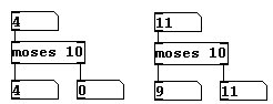 „moses“: Als Input kommt eine Zahl; diese wird von „moses“, je nach dem, ob sie im Verhältnis zum Argument kleiner oder größer/gleich ist, an verschiedene Outlets ausgegeben. Wenn man also „moses“ das Argument 10 gibt und als Input eine Zahl kleiner als 10, kommt diese im linken Outlet wieder heraus. Gibt man als Input 10 oder eine größere Zahl ein, kommt diese dann aus dem rechten Outlet heraus.