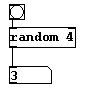 „Random“ erzeugt eine Zufallszahl innerhalb eines gegebenen Rahmens. Die untere Grenze ist standardmäßig („by default“) 0; die obere Grenze gibt man als Argument ein (nur ganze Zahlen); die obere Grenze ist exklusiv, das heißt, wenn man „random 4“ eingibt, kommt bei jedem Bang als Input unten eine zufällige Zahl heraus, und zwar entweder 0, 1, 2 oder 3.