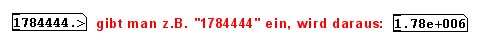 Ein weiterer Aspekt sind Zahlen größer als 999999. Sie werden vereinfacht dargestellt, nämlich als Produkt (mit max. zwei Kommastellen) von 1000000. Die 1000000 wird dargestellt als „e+006“.
