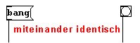 Ein Bang ist quasi ein Mausklick. Er kann also angeklickt werden und gibt diesen Klick weiter bzw. kann als Input einen Klick erhalten und darstellen (und wiederum weitergeben). Dieser Input muss aber nicht selbst ein Bang sein. Das Objekt „bang“ konvertiert jedes Kontroll-Ereignis, das es als Input erhält, in einen Bang, also zum Beispiel auch jede Zahl: