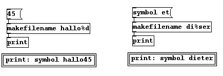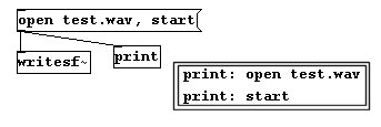 Betrachten wir in diesem Zusammenhang das Objekt „writesf~“ (ausnahmsweise sei hier noch ein Audio-Objekt eingeführt, da Symbole meist in diesen Zusammenhängen gebraucht werden; im Audio-Kapitel wird näher auf das Objekt selbst eingegangen), welches Klang als wav-Datei speichert. Es funktioniert folgendermaßen: Zunächst weisen wir ihm über die Message-Box den Namen zu, unter dem der Klang gespeichert werden soll, und zwar mit der Message: „open [Dateiname]“; wenn also die Datei zum Beispiel „test.wav“ heißen soll, dann lautet der Vorgang „open test.wav“. Danach geben wir mit den Messages „start“ und „stop“ Anfang und Ende der Aufnahme an.