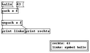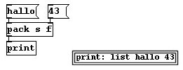 Die Message „open test.wav“ ist eine Verbindung aus zwei Symbolen (denn es sind zwei durch ein Leerzeichen getrennte Wörter). Eine solche Reihung von zwei oder mehreren Symbolen (oder Zahlen) nennt man „Liste“. Mit dem Objekt „pack“ kann man eine Liste aus mehreren „Elementen“ erstellen. Als Argumente gibt man Hinweise, welche Art von Elementen die Liste enthalten soll. Eine Zahl wird, wie bei „trigger“, mit „float“* (Abk. „f“) ausgedrückt, ein Symbol mit „symbol“ (Abk. „s“). Will man also aus den beiden Messages „hallo“ und „43“ eine Liste erstellen, verwende man das pack-Objekt wie dargestellt: