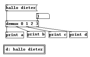 „route“ verteilt einen Input auf verschiedene Ausgänge, je nach Präfix. „demultiplex“ (Abk. „demux“, beide in pd extended) verteilt einen Input je nach Angabe im anderen Inlet auf verschiedene Ausgänge. Zunächst erhält „demux“ als Argument die Nummern der Ausgänge, angefangen bei 0: „demux 0 1 2 3“.
