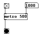 Das erste elementare Objekt hierfür ist „metro“. Wie der Name andeutet, handelt es sich um ein Metronom. Wenn man es einschaltet (ein- aussschalten mit 1/0 im linken Eingang, also dem Toggle), erscheinen unten Bangs in dem zeitlichen Abstand, den man durch ein Argument bzw. im rechten Input angibt.