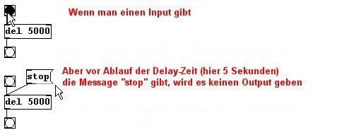 „delay“ (Abk. „del“) verzögert einen eingehenden Bang um so viele Millisekunden wie dem Argument bzw. rechten Input entsprechen: