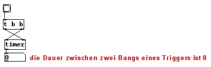„timer“ ist eine Art Stoppuhr. Bei beiden Eingängen gibt man Bangs. Es wird immer der zeitliche Abstand zwischen dem linken Bang (den man daher zuerst gibt) und dem rechten gemessen (in Millisekunden):