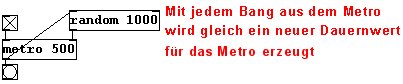 In diesem Beispiel kommen aus dem „metro“ Bangs im Abstand zwischen 0 und 999 Millisekunden (per Zufall). Will man z.B. Dauern im Abstand zwischen 500 und 1500 Millisekunden haben, muss man eine grundsätzliche Addition hinzufügen: