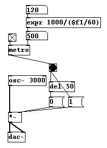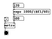Bauen wir es zuerst nur optisch, so dass als Metronomsignal ein Bang ausgegeben wird. Metronomangaben erfolgen als Schläge pro Minute, so wie in Partituren verzeichnet ist: Viertel = 60, Viertel = 100 etc.
