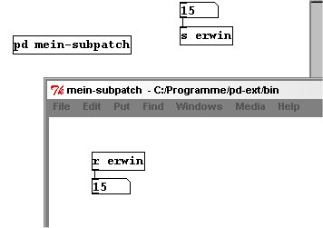 Es gibt zwei Verbindungsmöglichkeiten zum darüberliegenden ersten Fenster des Patches: „send“ und „receive“ funktionieren über verschiedene Fenster hinweg genauso wie innerhalb eines Fensters: