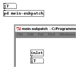Die andere Möglichkeit der Verbindung besteht über die Objekte Inlet und Outlet. Platziert man im Unterfenster einen Inlet, erscheint im Objekt für das Unterfenster („pd mein-subpatch“) ein Eingang.