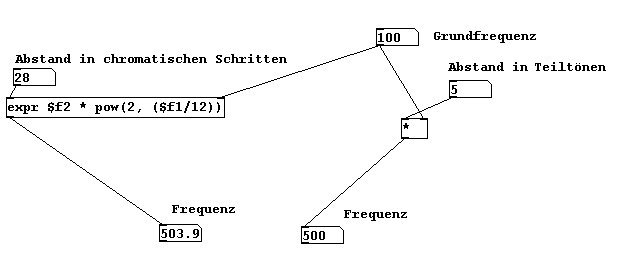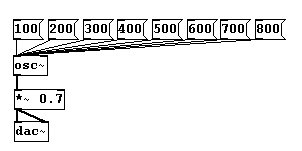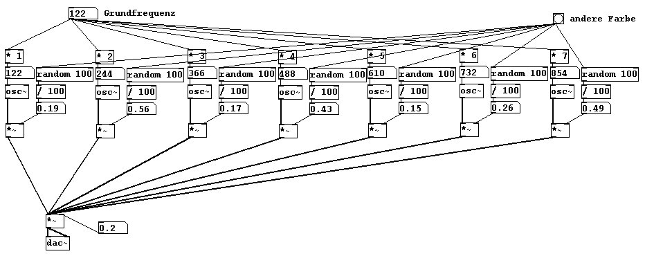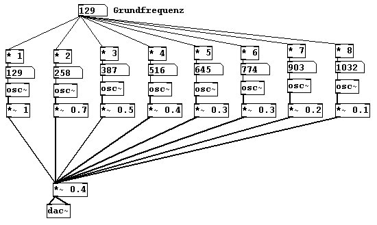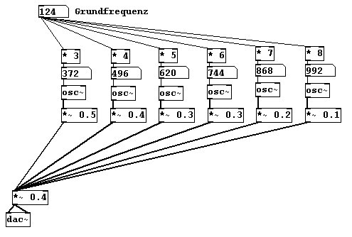 Mit mehreren „osc~“-Objekten, deren Frequenzen also eine additive Reihe darstellen, kann man einen Teiltonakkord erstellen:
