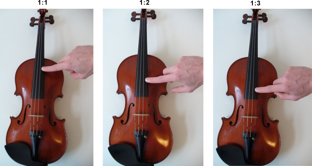 Die Zahlenverhältnisse beschreiben die Längen der beiden Saitenteile zueinander.