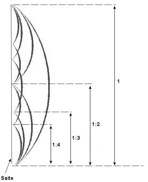 Sie entsteht ebenso, wenn man dem Experiment von Pythagoras (ca. 570 - ca. 510 v. Chr.) folgt, durch Teilung einer Saite in verschiedene Proportionen: