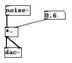 Bei „noise~“ bewegt sich die Membran per Zufall hin und her; beim Ein- und Ausschalten hören wir keinen Klick, denn Noise besteht nur aus mehr oder minder starken Klicks. Wir benötigen hierbei keine „Rampe“ (vgl. 3.1.2.1.2).