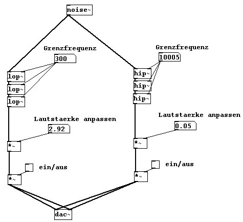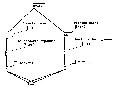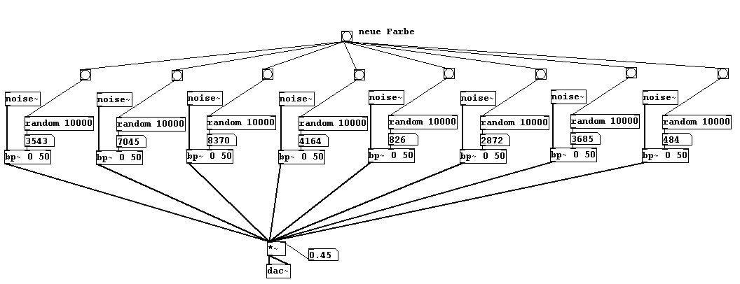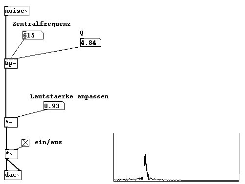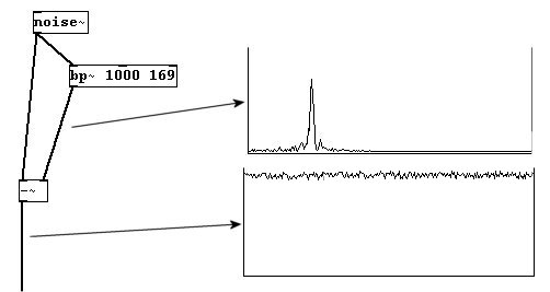 Claude Debussy entgegnete einmal auf die Frage, wie er komponiere, dass er einfach alle Töne nehme und dann die, die er nicht möge, wieder weglasse. Er nahm die Idee der Filterung vorweg. Anders als die additive Synthese, die quasi vom Atom des Klanges, dem Sinuston, ausgeht, verwendet die subtraktive Synthese zunächst allen Klang und reduziert ihn dann. Allen Klang zu erzeugen ist tatsächlich möglich. Sämtliche Frequenzen auf einmal erhält man, wenn die Membran des Lautsprechers völlig zufällig, chaotisch schwingt. Dafür ist in Pd das Objekt „noise~“ verantwortlich: