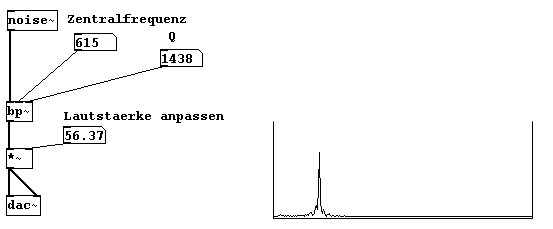 Eine weitere Filterart ist der „Bandpass“. Hier wird nur ein kleiner Teil um eine Zentralfrequenz herum durchgelassen, eine Art 'Band' von Frequenzen. Als Argumente / Inlets gibt man die Zentralfrequenz und die Stärke des Bandes, genannt „q“.
