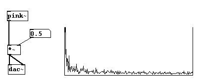 Neben dem weißen Rauschen gibt es auch das „rosa“ Rauschen. Das menschliche Ohr hört nicht alle Frequenzbereiche gleich laut. Am besten hört es um 2000Hz herum, darum klingt weißes Rauschen auch eher hoch. In der Tiefe und in der Höhe hören wir wesentlich schlechter. Will man ein Rauschen erzeugen, das der Mensch tatsächlich als gleichmäßiges Summe aller Frequenzen hört, muss dies dem Ohr angepasst werden, müssen vor allem die tiefen Frequenzen also maßgeblich lauter sein als die mittleren. Diese Verteilung nennt man rosa Rauschen und kann in Pd mit „pink~“ erzeugt werden: