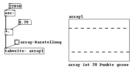 Nach dieser Idee, der sample-weisen Verschiebung (Delay) und Addition, verfahren digitale Filter. Bei dem „biquad~“-Filter kann man dies von Hand einstellen. Er führt folgende Differenzfunktion durch: y(n)=ff1*w(n) + ff2*w(n-1)+ff3*w(n-2) mit w[n]=x[n]+fb1*x[n-1]+fb2*x[n-2]. n ist hierbei die Sampleposition und ff1, ff2, ff3, fb1 und fb2 frei zu wählende Faktoren. In Pd erhält „biquad~“ entsprechend fünf Argumente für ff1, ff2, ff3, fb1 und fb2. Seine Syntax lautet: „biquad~“ [fb1] [fb2] [ff1] [ff2] [ff3]. Für den eingangs aufgeführten Fall der Welle von 22050 Hertz könnte wir also „biquad~ 0 0 1 1 0“ schreiben. Damit werden hohe Frequenzen unterdrückt, am stärksten die Welle mit 22050 Hertz, die komplett ausgelöscht wird. Folglich also ein Lowpassfilter: