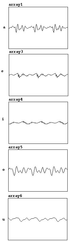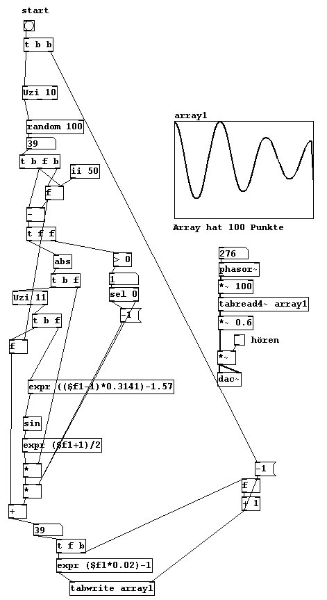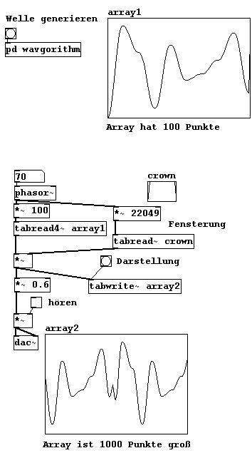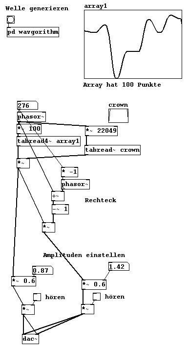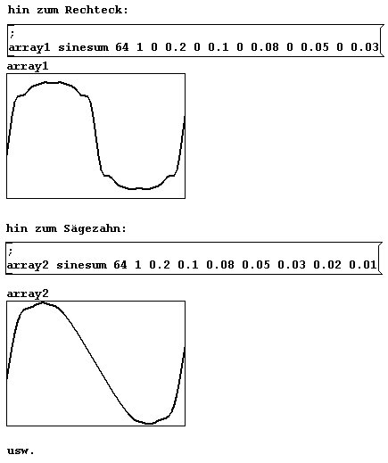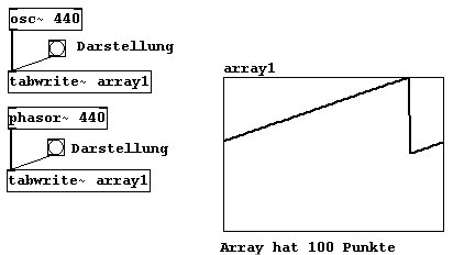 Wir haben bereits unter 3.1.1.1.2 verschiedene Wellenformen kennengelernt (Sinus, Sägezahn, Dreieck, Rechteck und Puls). Für zwei dieser Wellenformen gibt es in Pd Objekte, die sie eigens erzeugen, nämlich „osc~“ für den Sinus, „phasor~“ für den Sägezahn. Mit einem Array können wir die Wellenformen nun immer gleich darstellen: