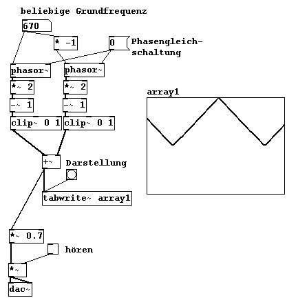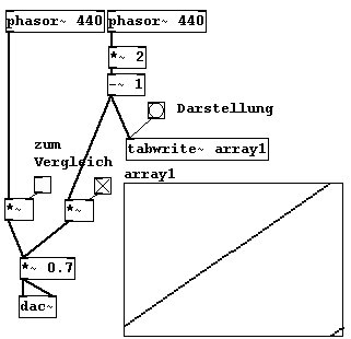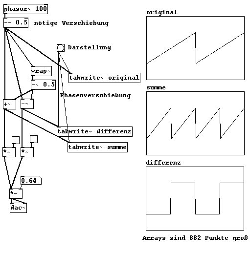 Und nun die Sägezahn-Zerteilung. Durch das „wrap~“-Objekt erzielen wir eine Phasenverschiebung des Sägezahns – diese addiert bzw. subtrahiert mit dem Originalsignal ergibt einen doppelt so schnellen Sägezahn und ein Rechteck.
