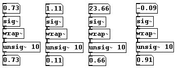 Man kann auch einen Sägezahn in gerade und ungerade Teiltöne zerlegen. Wir bedienen uns hierbei des „wrap~“-Objekts. Es berechnet die Differenz von der Eingangszahl zur nächst darunter liegenden Integerzahl (Ausgabe wird immer in den positiven Bereich gebracht). Kurz ein paar Beispiele hierfür: