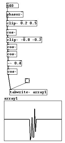Wir können nun aber auch anderen Wellenformen erzeugen, wenn wir ein paar Rechenoperationen an den „phasor~“ anbringen. Neu ist dafür das Objekt „clip~“, das 'überstehende' Bereiche wegschneidet. Man gibt als Argumente zwei Zahlen für die untere und obere Grenze, an der jeweils 'abgeschnitten' werden soll: