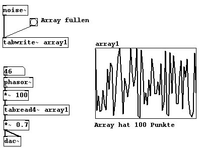 Das Spektrum dieses Klanges ist natürlich nicht mehr genau absehbar. Jedes Mal, wenn wir den Array mit Zufallszahlen aus dem „noise~“ füllen, erhalten wir eine neue Welle mit neuen Charakteristika.