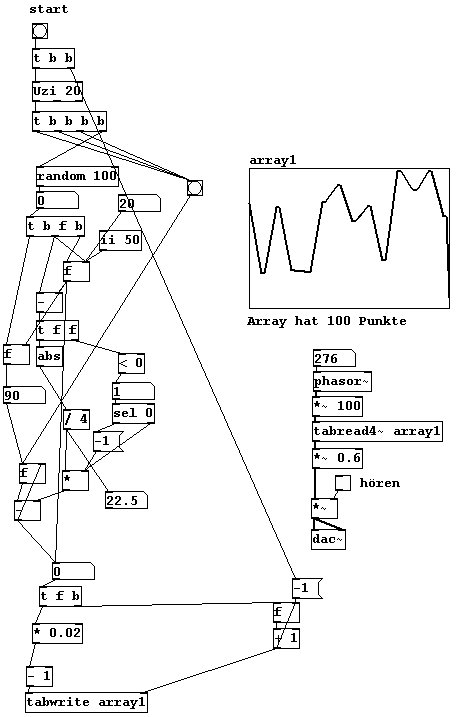 Aber eine gewisse Systematik lässt sich doch erkennen. Wir können beispielsweise Klicks, also große Sprünge innerhalb der Welle interpolieren, um zu einem weicheren Resultat zu kommen. Generieren wir also Zufallspunkte mit linearer Interpolation dazwischen („Uzi“ aus Pd-extended erzeugt so schnell wie möglich so viele Bangs hintereinander, wie als Argument gegeben sind):