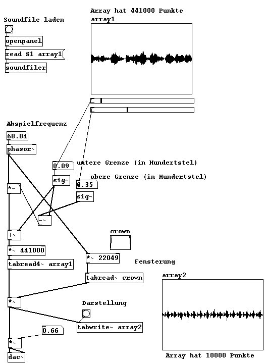 Nun sollte auch noch der Anschluss von hinten nach vorne interpoliert werden. Dazu empfiehlt sich eine Fensterung; die Berechnung bringen wir in einem Subpatch unter.