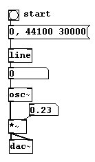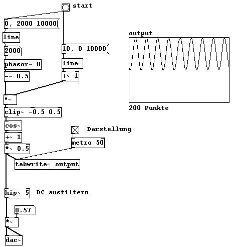 Man beachte: Der Sägezahn des „phasor~“ geht immer von 0 bis 1, kommt also nie in den negativen Bereich. Man könnte ihn aber dahingehend noch etwas kräftigen, mit einer kleinen Rechnung: