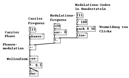 Die Freqenzmodulation wird auch Phasenmodulation genannt und kann in dieser Form erstellt werden. Dazu wird der Carrier-Oszillator aufgeteilt in Phasenberechnung und Wellenformberechnung. Das funktioniert so: