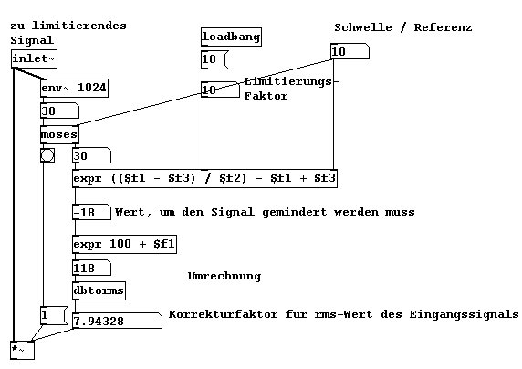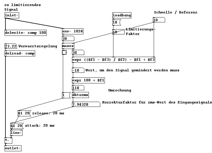 Beachten wir dabei zwei Aspekte: „env~“ macht eine Durchschnittsrechnung innerhalb der angegebenen Samples, hier immer in einem Zeitfenster von 1024 Samples. Das ergibt eine Verzögerung von 1024/44.1=23.22 Millisekunden, die wir einstellen können. Wir können aber auch die Reduktion schon beginnen lassen, ehe das Signal die Schwelle überschreiten wird, das heißt das Originalsignal noch länger verzögern. In der Signalverarbeitung ist der Fachausdruck dafür „Vorwärtsregelung“. Ist die Verzögerung des Originalsignals geringer bzw. die Verzögerung der Korrektur größer, spricht man von „Rückwärtsregelung“. Dabei kommt es aber kurz zum Überschreiten der Schwelle, ehe die Korrektur einsetzt. Andererseits stellt sich die Frage, in welcher Geschindigkeit die Korrektur vollzogen werden soll und ebenso in welcher Geschwindigkeit nach Rückkher unter die Schwelle wieder zur originalen Lautstärke zurückgekehrt werden soll. Man spricht von „attack“ und „release“-Zeiten.