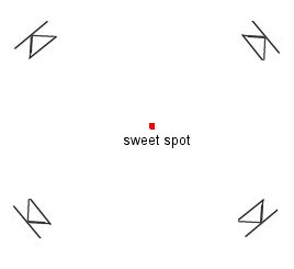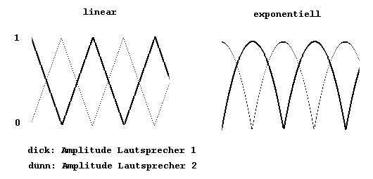 Auch hier funktioniert der Effekt aber nur dann richtig, wenn man sich genau in der Mitte („sweet spot“) befindet. Zudem hört man im obigen Beispiel noch ein deutliches 'Loch' in der Lautstärke zwischen den beiden Höchstwerten der Lautstärke der jeweiligen Lautsprecher. Hier gilt es zu experimentieren, wie die Überlappung der Lautstärken sein soll, ob linear oder beispielsweise exponentiell (vgl. die Fenstertypen unter 3.9.4). Das muss das Ohr des Komponisten entscheiden.