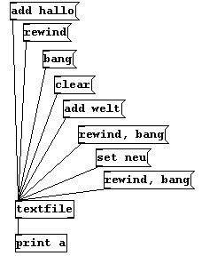 Wollen wir das Gespeicherte nun lesen, laden wir zunächst die Datei, gehen mit „rewind“ ganz an den Anfang, woraufhin mit jedem Bang eine Zeile (bis zum Semikolon) im linken Outlet ausgegeben wird. Ist die letzte Zeile erreicht, kommt aus dem rechten Outlet ein Bang.