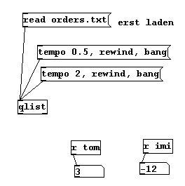 Eine praktische Erweiterung von „textfile“ ist „qlist“. Hiermit können wir zeitlich organisierte Nachrichten mit einer Textdatei an „receive“-Objekte senden. Wir haben die Datei „orders.txt“ mit dem Inhalt: