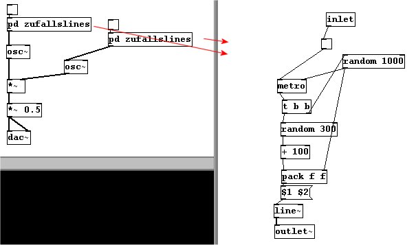 Wie man Subpatches in Pd anlegt, haben wir bereits unter 2.2.4.4 gelernt. Jetzt soll nur noch einmal verdeutlicht werden, wie sie sinnvoll zu gebrauchen sind.