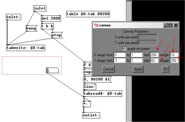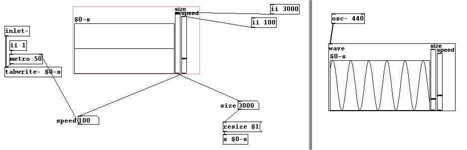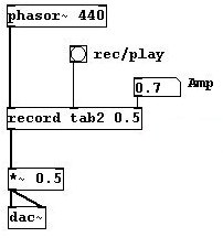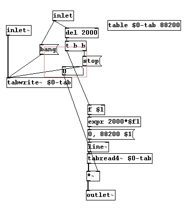 Haben wir nun einen universell anwendbaren Subpatch, zum Beispiel den folgenden, der zwei Sekunden in einen Array aufnimmt und dann mit einer bestimmten Geschwindigkeit und variablen Lautstärke abspielt:
